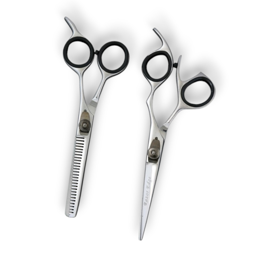 Razor Edge Shears Set. Enjoy Cutting Hair with Ergonomic Design. Finger Rest for Comfort and Stress Free Work. Surgical Steel, Hand Made and Polish Finish. Adjustable Dial Finger Ring Insert. School Owners Call for Private Label and Special Price. Trusted Quality. SALES